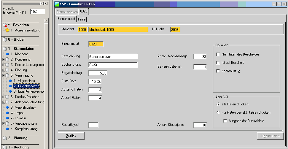 | Navigator | Steuern und Abgaben - Stammdaten - Einnahmearten | |