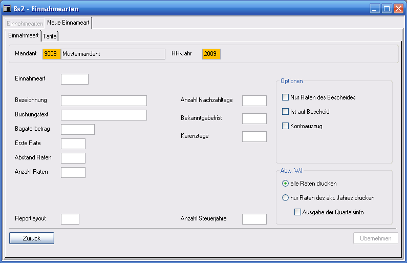 Übernehmen Die erfassten Daten werden gespeichert, die Einnahmeart wird angelegt