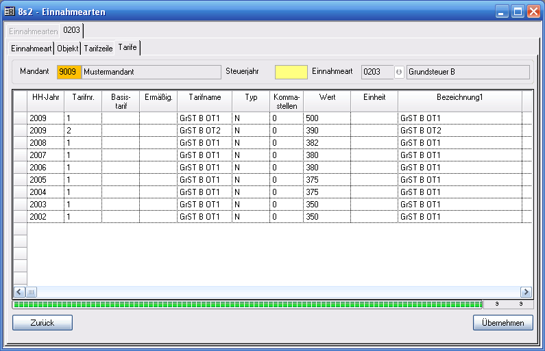 In dieser Registerkarte sind die Tarife (z.B. Hebesätze) für die einzelnen Steuerjahre des Mandanten hinterlegt. Die Einträge werden bei der Erfassung der Veranlagung und der anschließenden Berechnung verwendet.