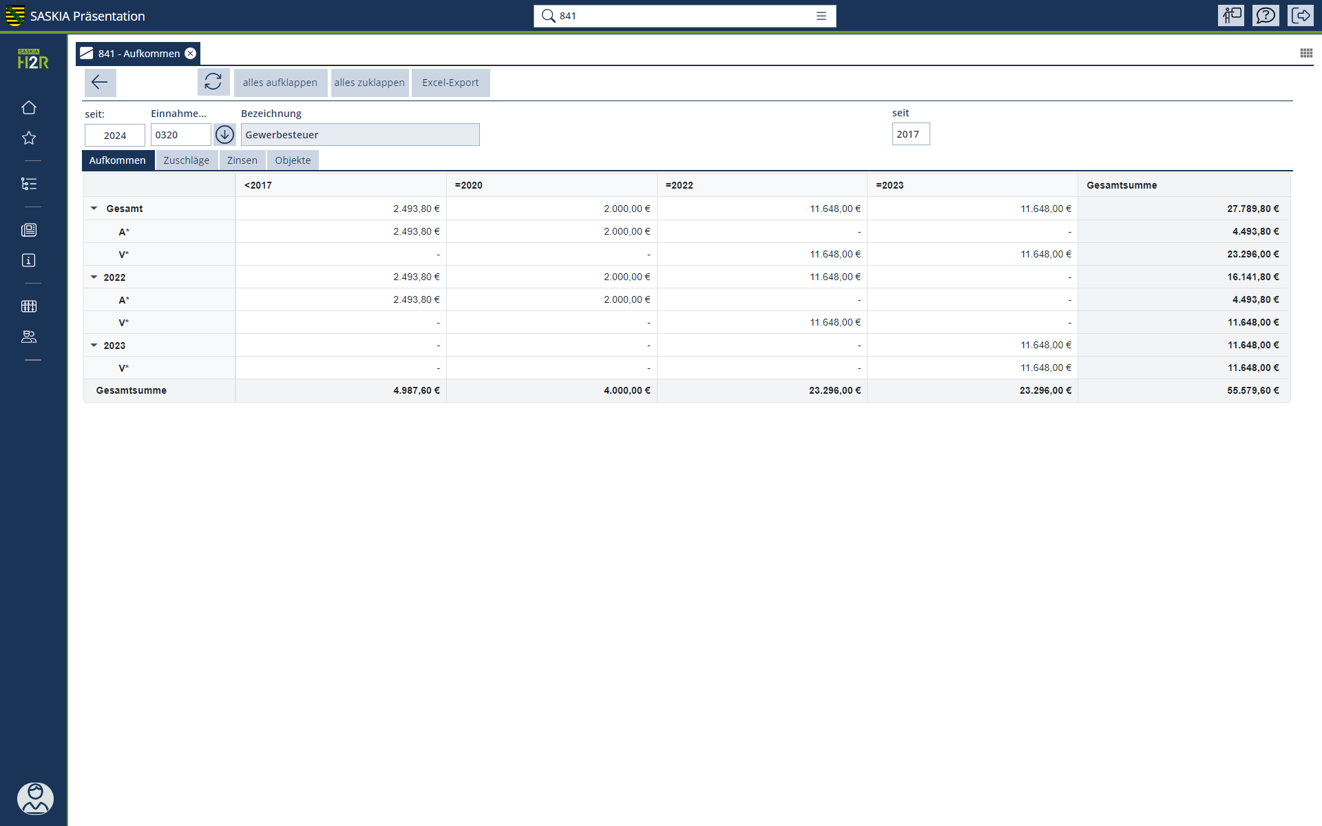 | Navigator | Veranlagung - Auswertungen - Aufkommen |