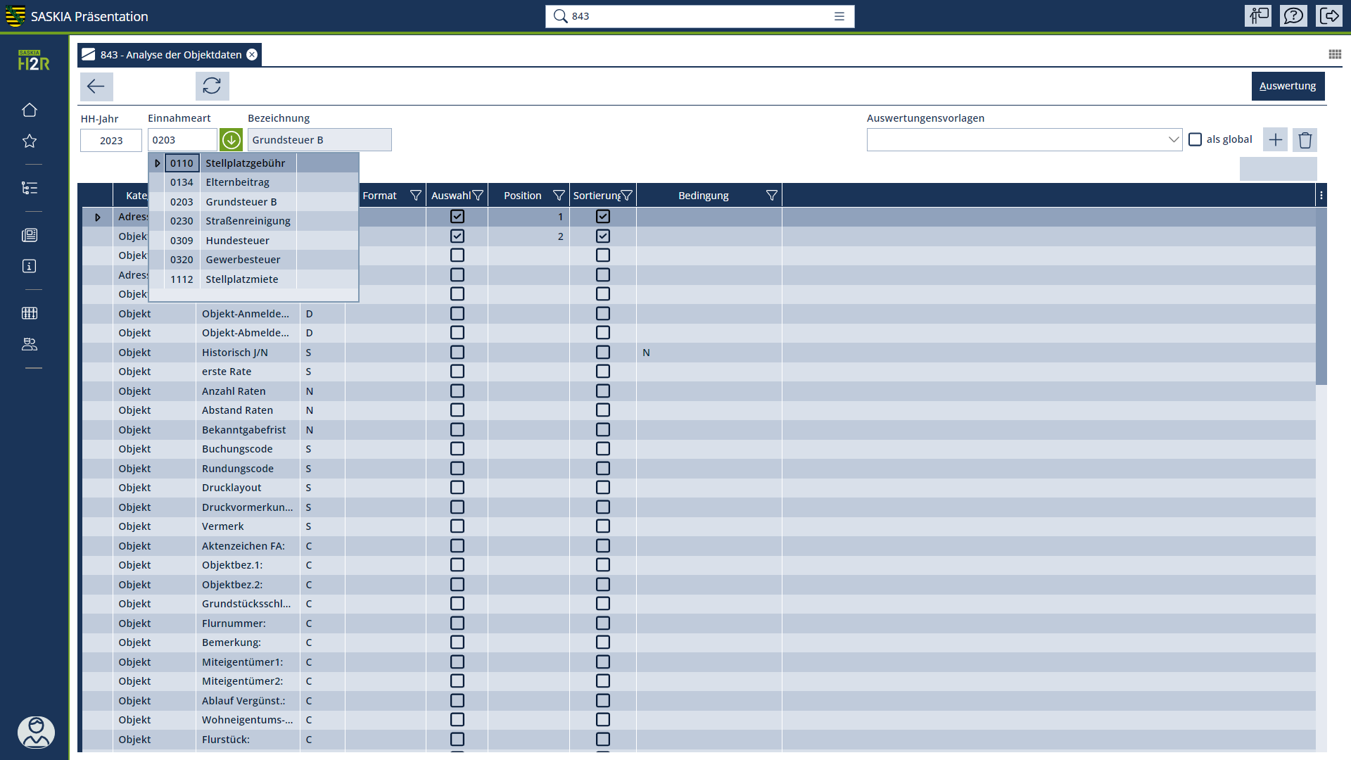 Dieser Dialog dient zur Auswertung von Objektdaten in der Veranlagung. Es handelt sich dabei um eine Auflistung von frei wählbaren Informationen zu Veranlagungsobjekten. In einer Tabelle werden die möglichen Datenfelder angezeigt, die für die Auswertung ausgewählt werden können. Für jedes dieser Felder kann auch eine Bedingung zur Einschränkung des Ergebnisses eingegeben werden.