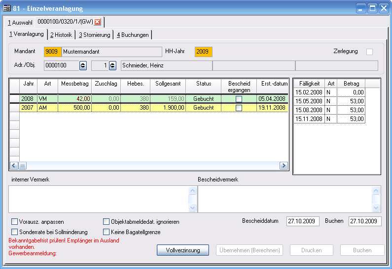 In der Übersichtstabelle können für angefangene und unverbuchte Veranlagungen die Dateneingaben direkt in den Tabellenfeldern verändert und danach die Werte neu berechnet werden. Durch Markieren einer vorhandenen Jahreszeile in der Tabelle oder Betätigung der Einfg-Taste kann ein neuer Vorgang für nicht vorhandene Steuerjahre angelegt und mit Eingaben aufgefüllt werden. Es können mehrere Jahre pro Bescheid verwaltet werden. Mit Betätigung des Buttons "Übernehmen" werden zunächst nur noch die geänderten Steuerjahre angezeigt, alle existierenden Steuerjahre sind erst nach dem Verbuchen wieder sichtbar. Bereits durchgeführte Veranlagungsvorgänge werden durch den eingetragenen Status gekennzeichnet, für manuell erstellte Bescheide wird die Option "M" gesetzt. Fehlerhaft angelegte Veranlagungszeilen können durch Doppelklick auf den Zeilenkopf mit einem "X" zum Löschen markiert und anschließend mit "Übernehmen (Berechnen)" aus der Tabelle entfernt werden. In den Feldern "interner Vermerk" und "Bescheidvermerk" besteht zusätzlich die Möglichkeit, gegebenenfalls Erläuterungen o.ä. zu dieser Veranlagung zu hinterlegen. Abschließend erfolgen die Datumseingaben in den Feldern "Bescheiddatum" und "Buchen". Die Veranlagungseingaben werden mit dem Button "Übernehmen (Berechnen)" zunächst geprüft und abgespeichert. Gleichzeitig werden auf Basis des angegebenen "Bescheiddatums" im rechten Infofeld die berechneten Raten und die dazu gehörigen Fälligkeiten angezeigt. Danach erfolgt über den Button "Drucken" die Ausgabe des Veranlagungsbescheides. An dieser Stelle kann außerdem eine Druckwiederholung gestartet werden. Für bereits gebuchte Veranlagungsbescheide ist der Nachdruck sowohl über die Registerkarte "Historik" als auch über das Archivsystem möglich. Nach erfolgreichem Bescheiddruck kann abschließend über den Button "Buchen" die Sollstellung an das Buchungssystem übergeben werden und ist danach im Buchungsstapel vorgemerkt.