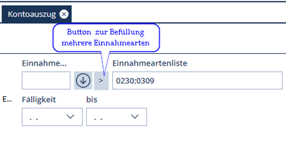Nach Öffnen des Dialogfensters ist das Personenkonto bzw. der Personenkontenbereich eingegeben, für den der Auszug erstellt werden soll. Außerdem kann der Personenkontenauszug für eine Einnahmeart ausgegeben werden, dazu ist eine entsprechende Eingabe im Selektionsfeld „Einnahmeart“ vorzunehmen. Sollen mehrere Einnahmearten berücksichtigt werden, sind diese der Reihenfolge nach auszuwählen und durch Druck auf den Button