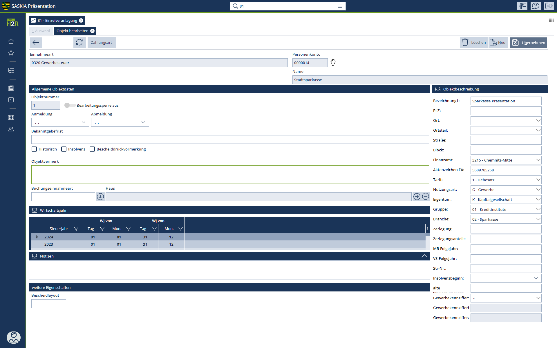 geladen werden. Danach sind die Eingaben zum zuständigen Betriebsfinanzamt, Aktenzeichen und Gewerbean- bzw. -abmeldetermin zu hinterlegen. Die Zuordnung des Steuerobjektes in den Feldern "Gruppe" und "Branche" haben eher informativen Charakter und können später zu statistischen Auswertungen herangezogen werden. Weitere wichtige Eingaben für die spätere Veranlagung sind anschließend in den Feldern "Eigentum" und "Tarif" zu hinterlegen. Bei Bedarf kann nun noch eine von den Stammdaten abweichende Bekanntgabefrist und ein abweichender Messbetrag für das Folgejahr in den gleichnamigen Feldern angegeben werden. Für nähere Informationen zum angelegten Gewerbesteuerobjekt steht das Textfeld "interner Vermerk" zur Verfügung. Abschließend besteht die Möglichkeit, über die Optionen "Historisch", "Zerlegung" und Bescheiddruckvormerkung" das Objekt zu kennzeichnen, bevor mit der Betätigung des Buttons "Übernehmen" die Eingaben gespeichert werden.