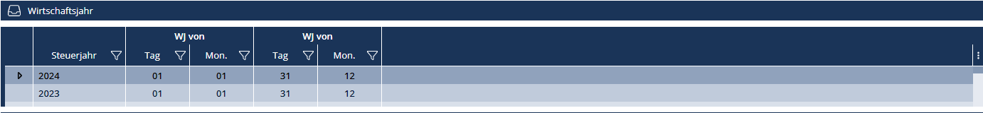In der Tabelle ist für jedes Wirtschaftsjahr die Anfangs- (WJ von) und Endperiode (WJ bis) zu hinterlegen. Die Werte im Feld "Tag" werden automatisch gefüllt. Wenn Wirtschaftsjahr = Kalenderjahr ist in den Felder "WJ von" 01/01 und "WJ bis" 31/12 zu erfassen. Diese Angaben werden auch programmseitig eingetragen, wenn beim Anlegen des Objektes die Erfassung der Daten zum Wirtschaftsjahr nicht erfolgt. Bei Veranlagung nach abweichendem Wirtschaftsjahr (abw. WJ) ist hier die Anfangs- und Endperiode (Monat) und das Jahr als Zeitraum des abw. WJ einzutragen, in dem die abweichende Veranlagung erstmalig anzuwenden ist. Der Wechsel von einem WJ auf ein anders gelagertes WJ ist für das betreffende Steuerjahr in der jeweiligen Jahreszeile anzugeben. Liegt das Jahr in der Zukunft ist das betreffende Steuerjahr in einer zusätzlichen Jahreszeile (Einfg-Taste) anzulegen. (Programmseitig wird ein Überschneiden von Perioden verhindert)
