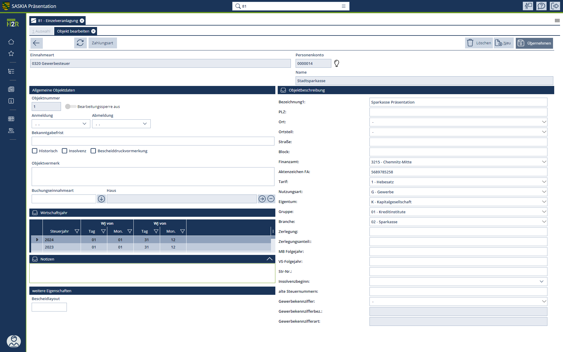 Über diesen Dialog werden Steuerobjekte für die Veranlagung von allgemeinen Steuern, wiederkehrenden Einnahmen und Gebühren neu angelegt bzw. bearbeitet.