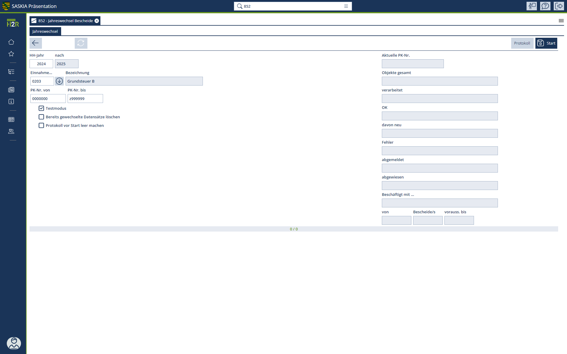 Testmodus Mit aktiver Option wird der Jahreswechsel nur simuliert. Anhand der Protokolldateien kann man so den aktuellen Veranlagungszustand feststellen, z.B. wo sind Veranlagungen angefangen, welche Objekte werden nicht gewechselt,...