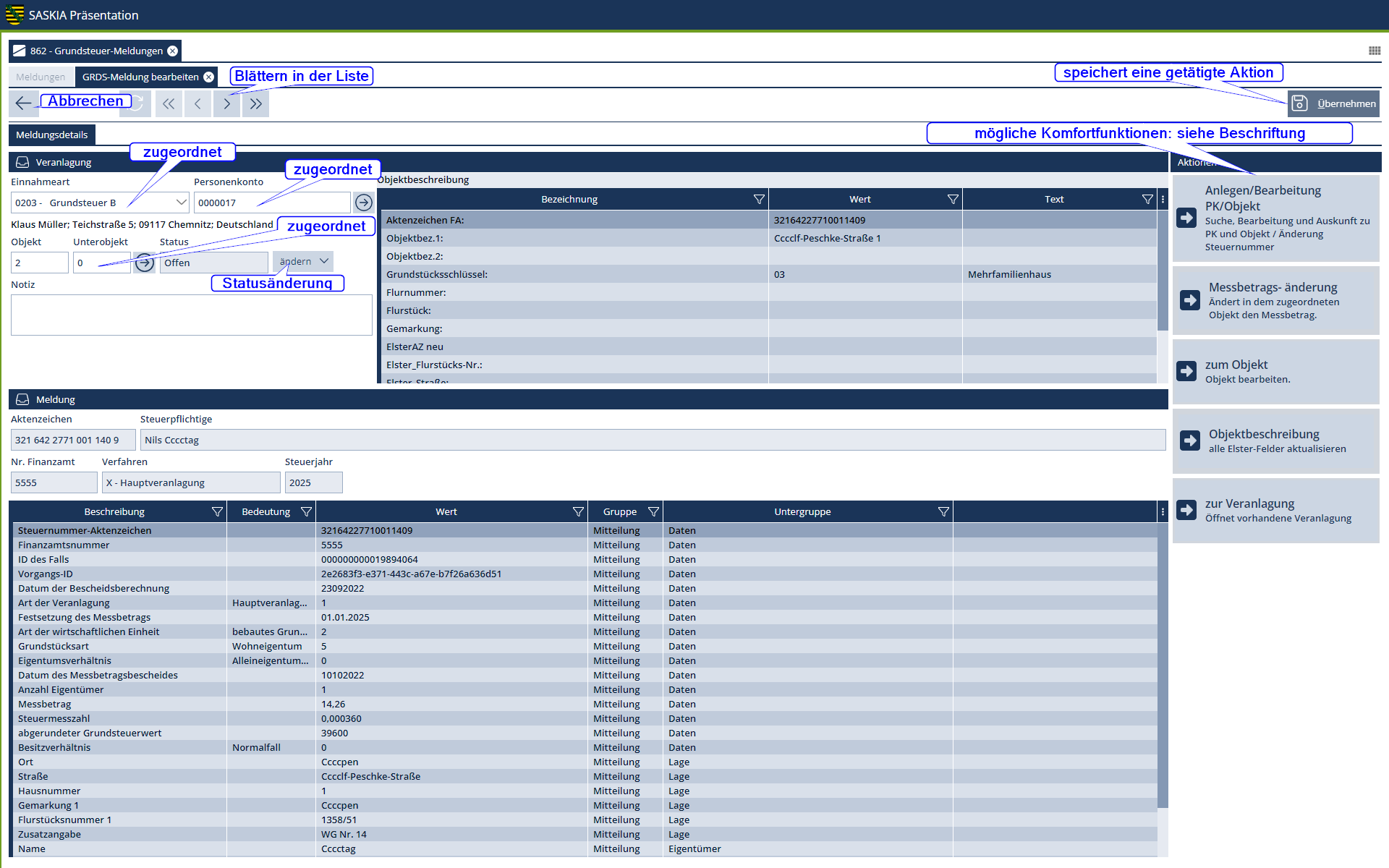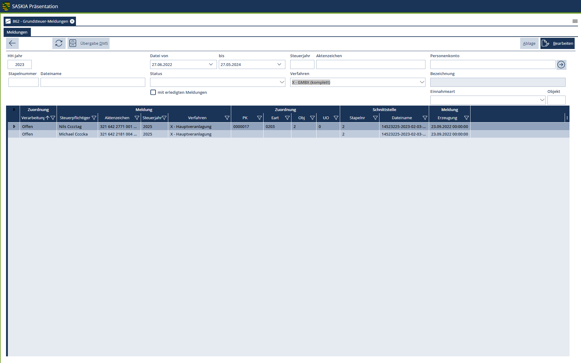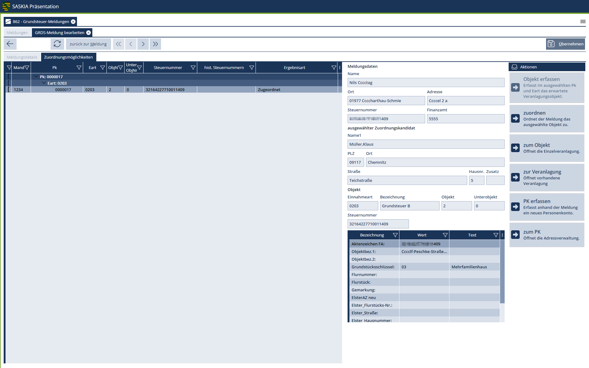 Mit diesem Menüpunkt werden über drei verschiedene Masken (Liste, Meldungsdetails und Zuordnungsmöglichkeiten) Grundsteuer-Meldungen über Elster angezeigt und bearbeitet.