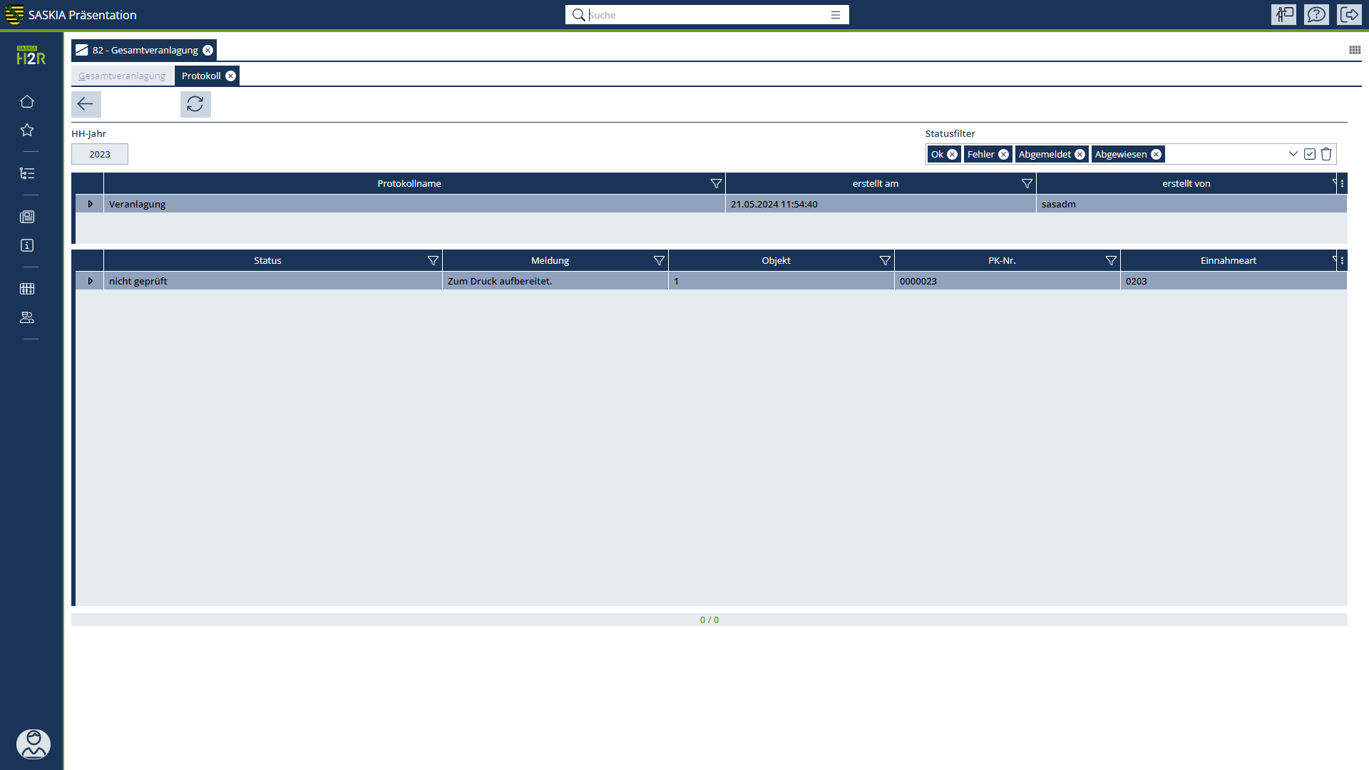 Protokoll Es wird in einem weiteren Dialogfenster nach Auswahl eines Protokollbereiches im Feld "Protokoll ab" (z.B. Abgewiesen) und Betätigung des Buttons "Anzeigen" das Vorgangsprotokoll angezeigt Bei ausgewiesenen Fehlern sind diese vor einer erneuten Durchführung des Programmschrittes zu beseitigen bzw. der SASKIA®.de HKR-Support zu konsultieren Weiterhin besteht die Möglichkeit, die Inhalte des Protokolls zu drucken oder zu speichern bzw. bereits gespeicherte Protokolle erneut zu öffnen.