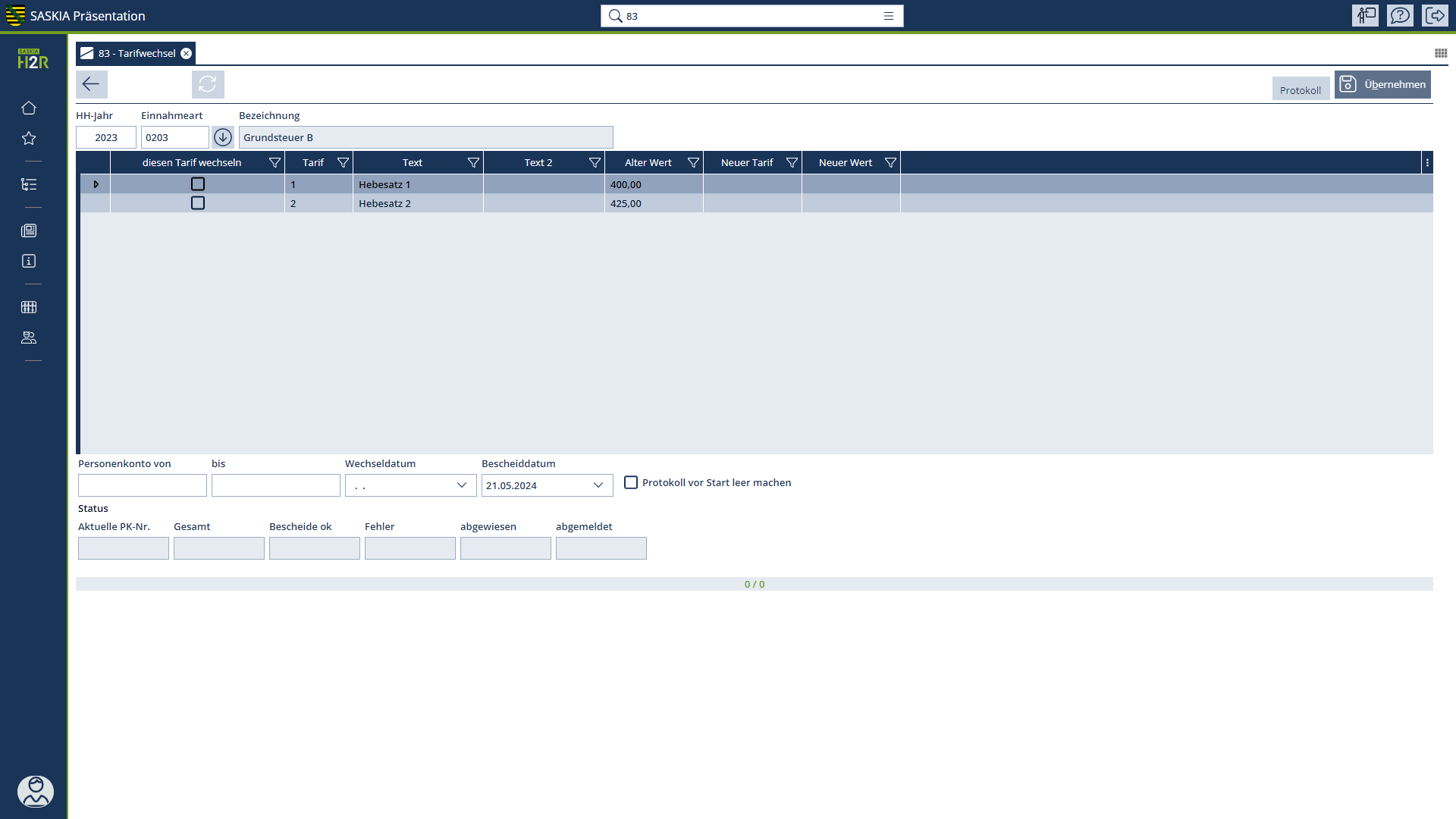 Dieses Menü dient der unterjährigen Änderung von Tarifen bzw. Hebesätzen des aktuellen Jahres. Hebesätze von Vorjahren dürfen nicht geändert werden.