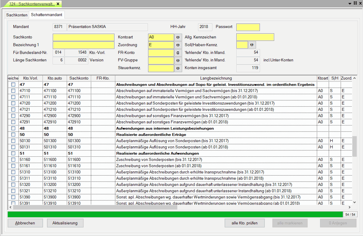 Wenn nicht bereits erfolgt, gilt es aus dem Schattenmandanten (Menü „124 - Sachkontenverwaltung“ -> Reiter „Schattenmandant“) ab dem Haushalsjahr 2018 folgende Konten neu anzulegen: