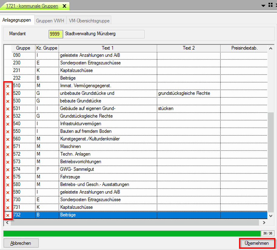 Zum Löschen wird das Menü „1721 - kommunale Gruppen“ aufgerufen und die zu entfernenden Gruppen mit einem Doppelklick durch ein rotes Kreuz zum Löschen markiert und der Vorgang im Anschluss daran mit „Übernehmen“ bestätigt.