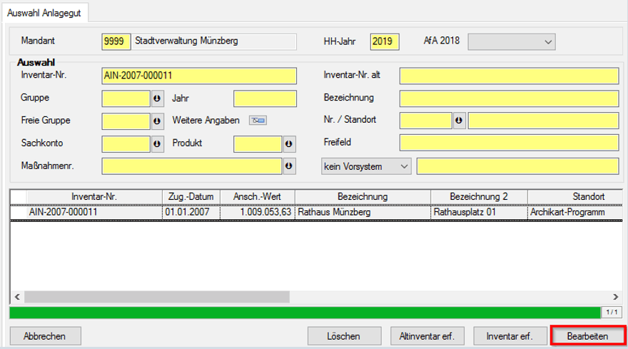 | Navigator | Anlagebuchhaltung - Anlagegüter - Bearbeiten |