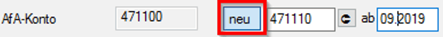 Neben dem Feld „AfA-Konto“ den „neu“-Button betätigen --> jetzt wird das neue AfA-Konto durch die automatische Vorschlagfunktion vorgeblendet --> im Feld „ab“ muss die Periode eingetragen werden, wann der Switch zum tragen kommt. Dies richtet sich nach dem Datum der anschließenden Buchung, welche den Switch begründet. --> mit „Übernehmen“ bestätigen