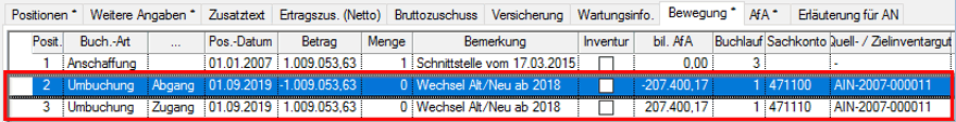 - in den Bewegungen zum Anlagegut wurde der Wechsel als Selbstverweis eingetragen --> diese Positionen müssen mit gebucht werden (Bewegungsart 20 - Umbuchung):