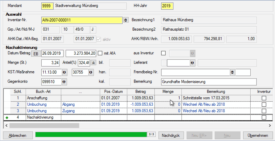Nachdem diese Schritte ausgeführt wurden, kann die eigentliche Buchung (z.B. Nachaktivierung) durchgeführt werden, welche den Switch zum „Neuanlagegut“ begründet.