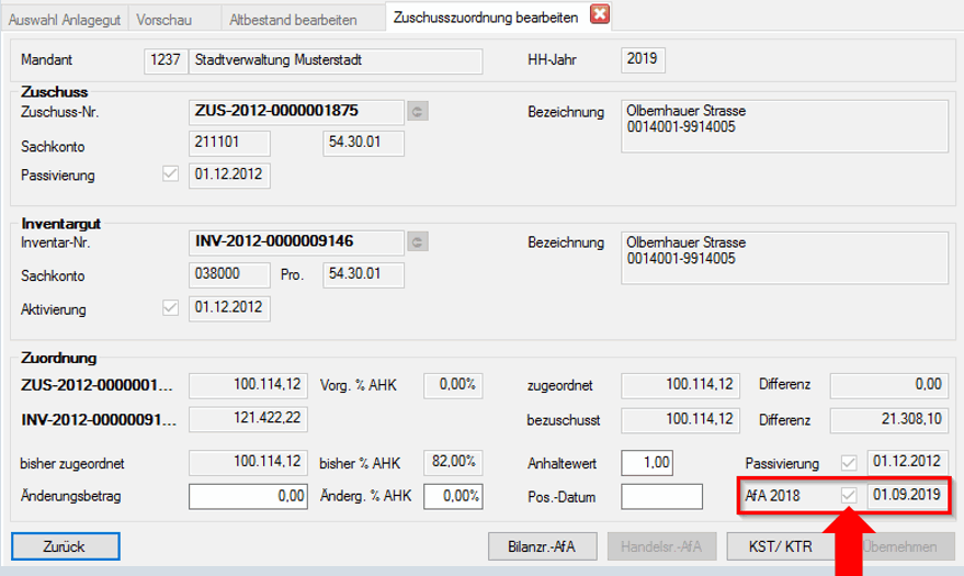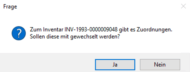 Sind mit dem zu switchenden „Altanlagegut“ ein oder mehrere Zuschüsse verknüpft, so fragt das Programm beim Wechsel, ob alle Zuschusszuordnungen automatisch mit geswitcht werden sollen. Ist dies nicht gewünscht so ist die Frage mit „Nein“ zu beantworten