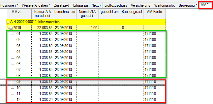 Grün = Anteil der unterjährigen AfA auf dem „alten“-Konto Rot = Anteil der unterjährigen AfA auf dem „neuen“-Konto
