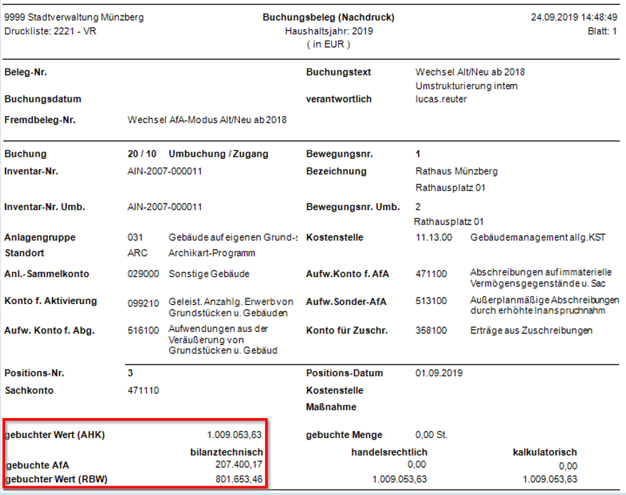 Erstellung eines Beleges über den Button „Nachdruck“ unter Auswahl einer der beiden „Wechsel-Positionen“. Der Beleg weißt den Restbuchwert zum „Switchzeitpunkt“ aus. Dieser wird benötigt um in der Finanzbuchhaltung eine Umbuchung zum Restbuchwert in die Sonderrücklage durchführen zu können.