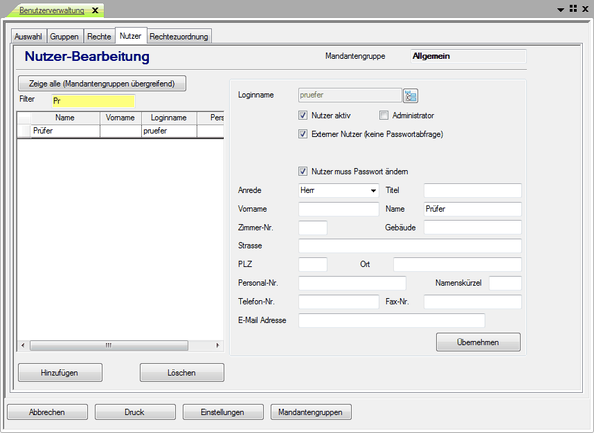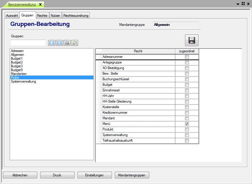 1) Anlegen einer neuen Rechtegruppe für den Prüfer.