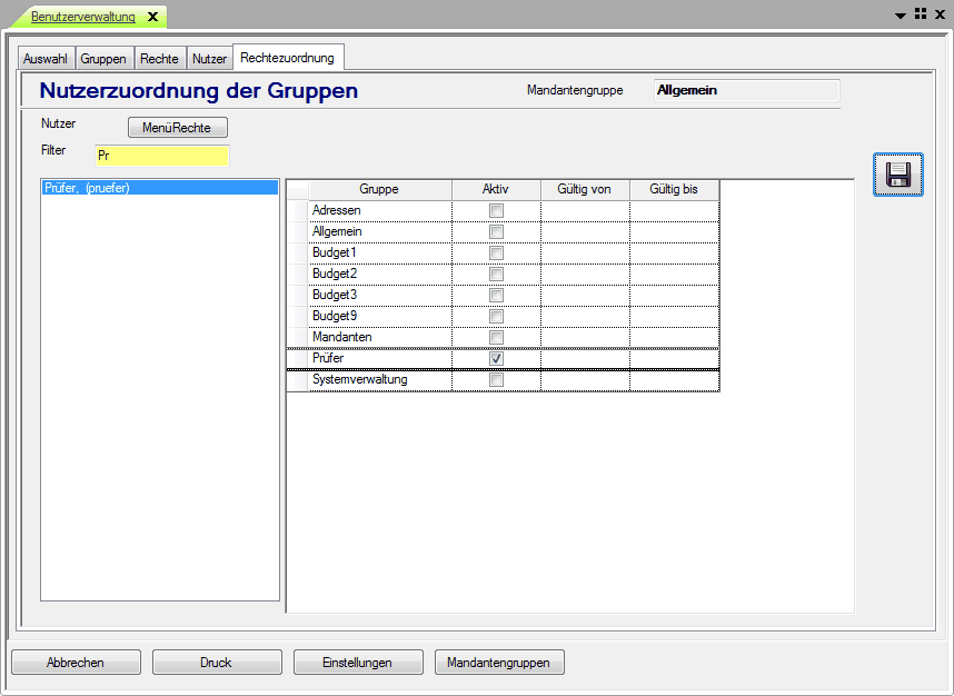 2) Zuordnen der Manürechte zur Prüfergruppe