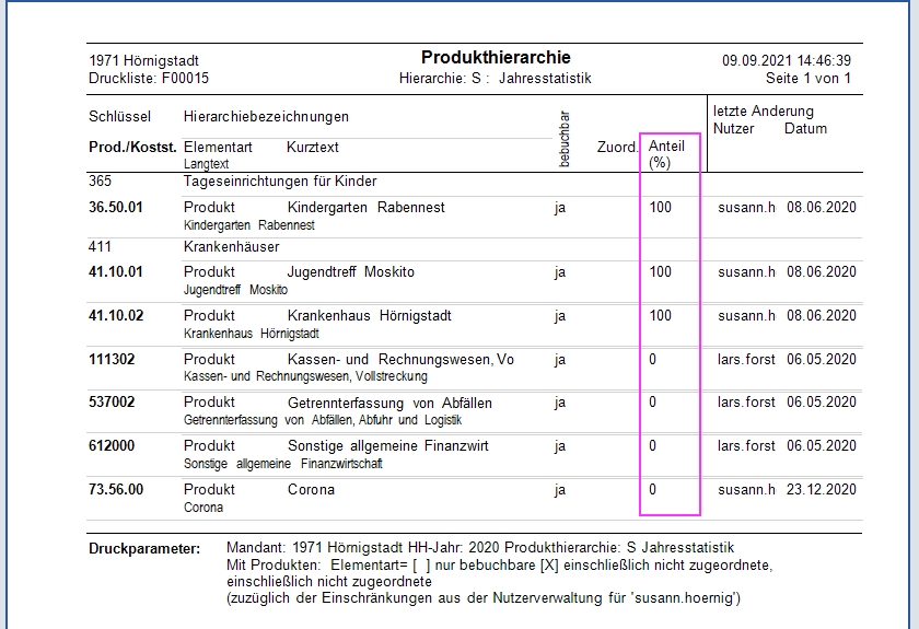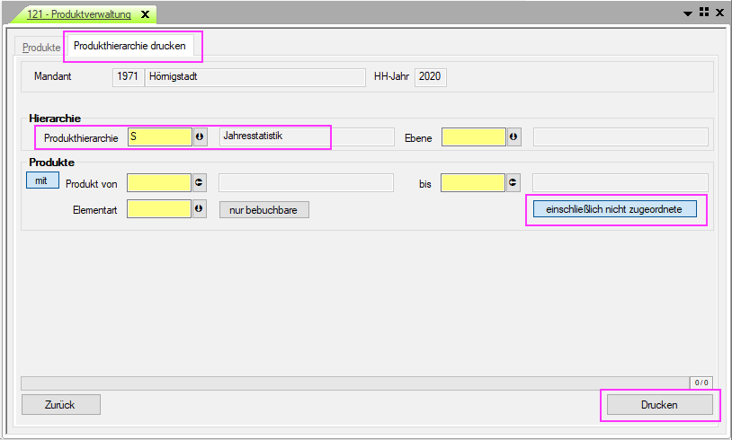 Im Menü 121 über den Button "Drucken" kann eine Prüfung iniziiert werden, die als Ergebnis alle Produkte aufzeigt, welche noch nicht der S-Hierarchie zugeordnet sind.