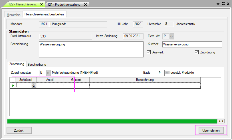 In der S-Hierarchie markieren Sie dazu die entsprechende Zeile, unter der das Produkt zugeordnet werden soll. Mittels "Bearbeiten" öffnet sich das Bearbeitungsfenster. Im Reiter "Zuordung" fügen Sie über die Einfg-Taste ein Eingabezeile hinzu. Der Abtauchen-Button im Feld "Schlüssel" ermöglicht eine Auswahl des gewünschten Produktes. In der Spalte "Anteil" hinterlegen Sie eine prozentuale Zuordnung zB. 100 für 100%. Die Eingaben sind mit "Übernehmen" zu bestätigen.
