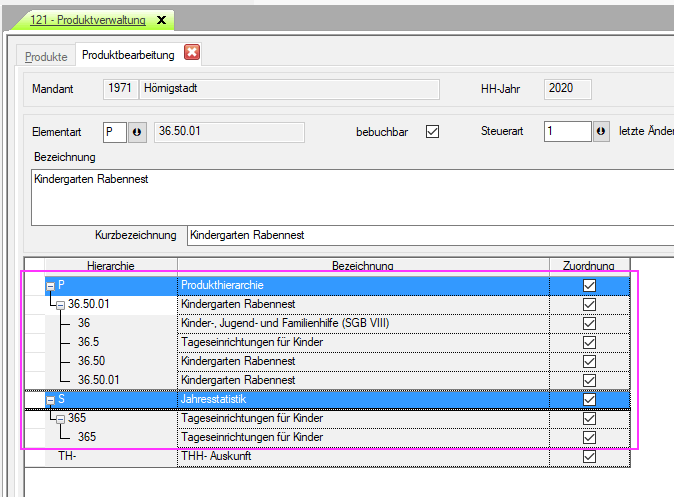 Im Menü 121 kann die Zuordnung eines Produktes zu den einzelnen Hierarchien ebenso überprüft werden: