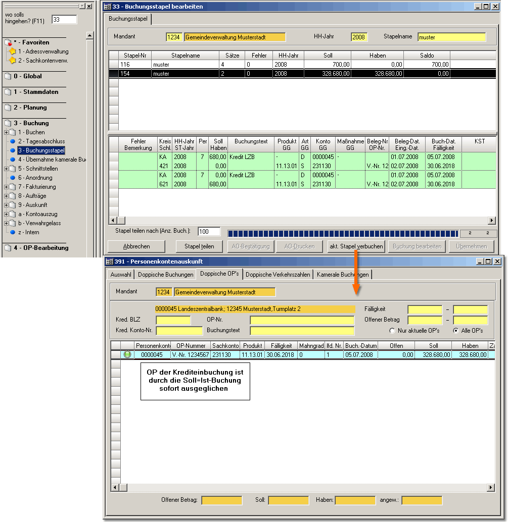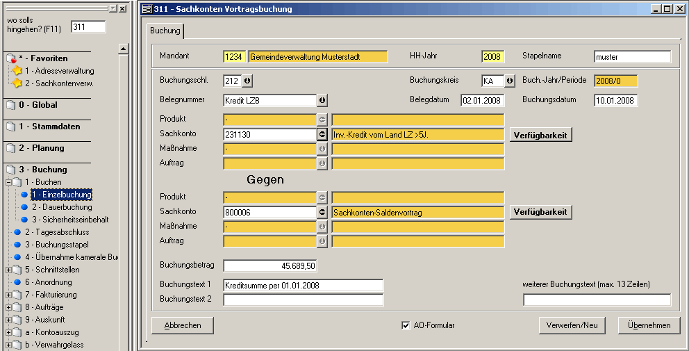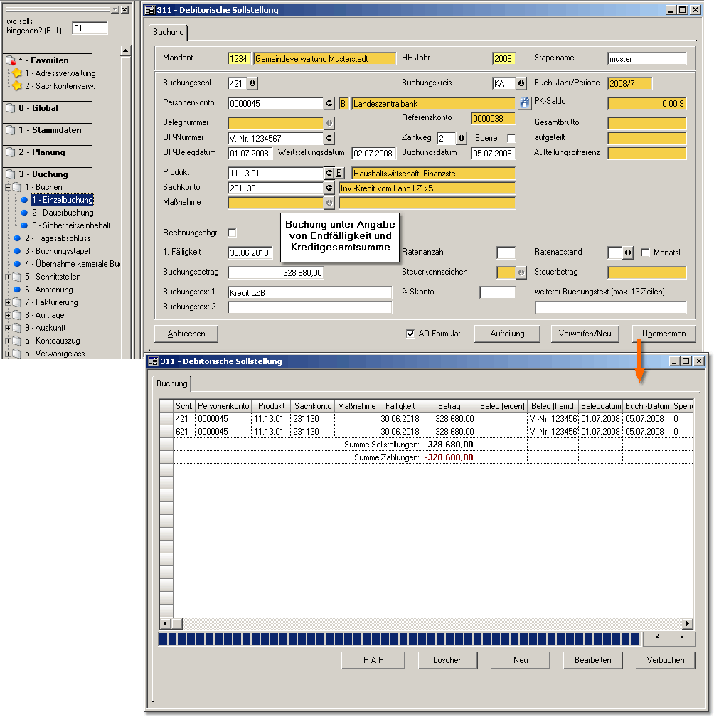 Neue Kredite werden im Rahmen einer debitorischen Sollstellung (Soll = Ist) auf das extra dafür angelegte Personenkonto eingebucht. Mit dem Buchungsschlüssel 421 wird die Bildung eines Offenen Postens in Höhe des Gesamtkreditbetrages erreicht, der im Personenkonto des Kreditgebers sofort wieder ausgeglichen wird. Sonderfall Altkredite: Kredite die bereits kameral aufgenommen wurden, sind für die Erstellung der doppischen Eröffnungsbilanz mittels einer Vortragsbuchung (Buchungsschlüssel 212) zu erfassen. In diesem Fall wird die Buchung des Restkreditbetrages zum EB-Stichtag unter Angabe der Endfälligkeit direkt auf dem Bilanzkonto vorgenommen.