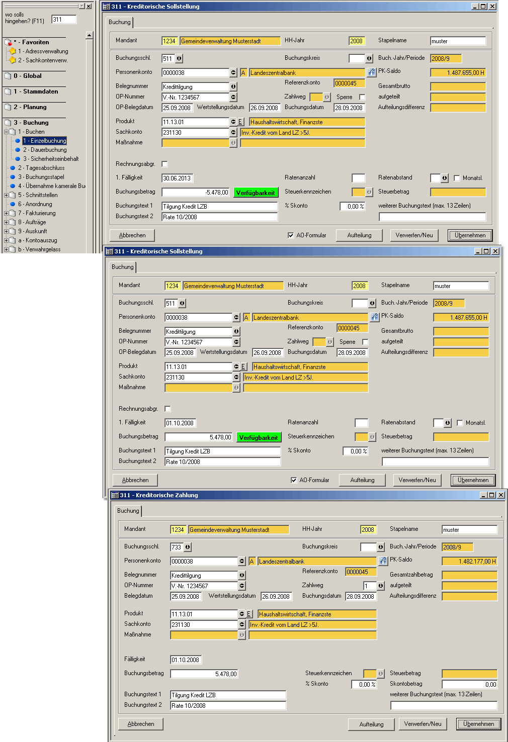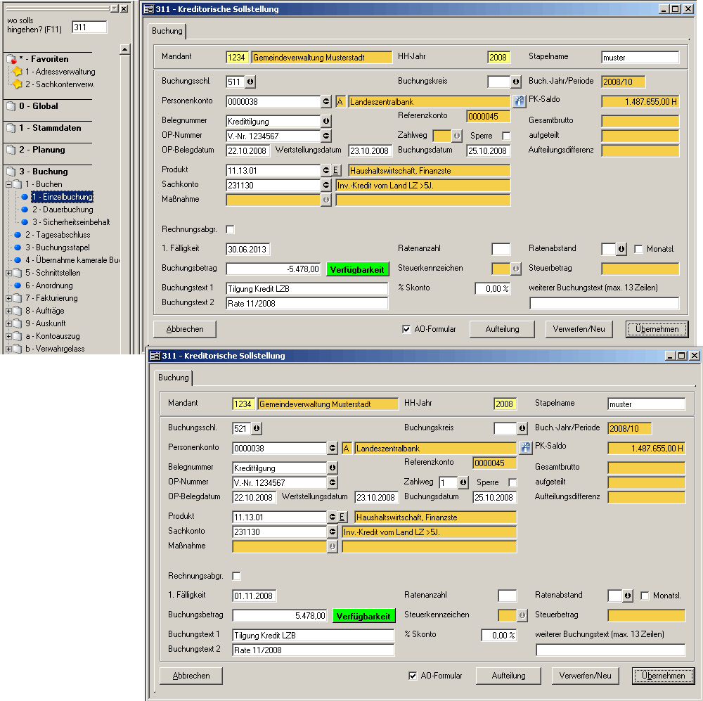 Vor der Tilgung von Krediten ist zunächst die Einrichtung aller erforderlichen Stammdaten und die Einbuchung einer Kreditaufnahme vorzunehmen.