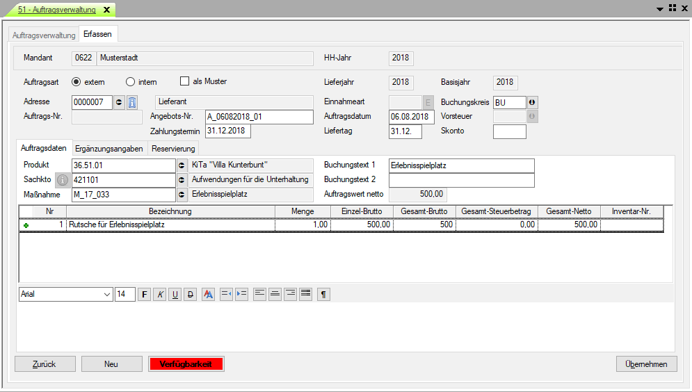 Es soll ein Auftrag erfasst werden. Für diesen Auftrag gibt es allerdings keinen Planansatz im aktuellen Jahr. Die Mittel kommen aus dem Vorjahr. 1.) Angeben der allgemeinen Auftragsdaten und mit der Einf-Taste eine Position anlegen.