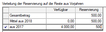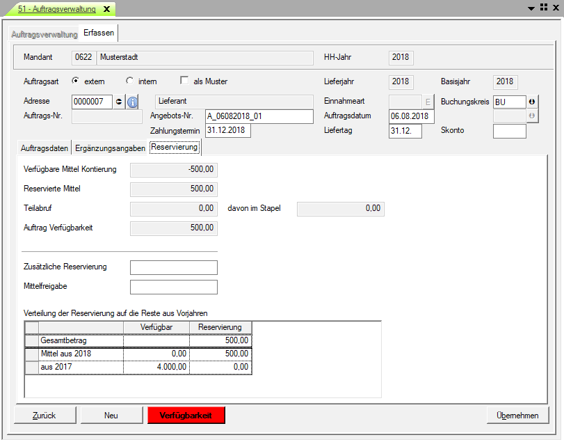 Nach Angabe der Auftragsdaten und anlegen der Position NICHT auf Übernehmen klicken. Die Verfügbarkeit wird in diesem Falle rot dargestellt, da die Verfügbarkeit im aktuellem Haushaltsjahr geprüft wird. Klickt man auf Übernehmen kann man nur Mittel aus dem aktuellen Haushaltsjahr in Anspruch nehmen. Dies darf aber nicht sein. 2.) Öffnen Sie die Registerkarte "Reservierung" In dieser Maske kann nun angegeben werden das die benötigten Mittel aus dem Vorjahr in Anspruch genommen werden sollen.
