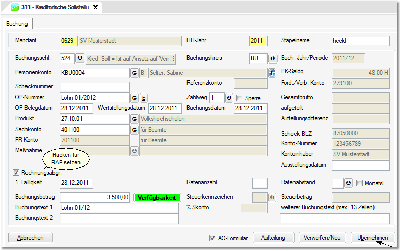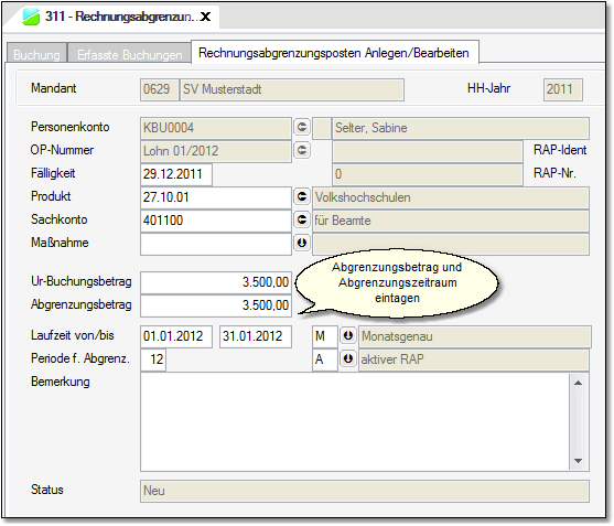 Buchung mit Buchungsschlüssel 524 mit Kreditor – auf dem auch die Lohnauszahlung an die Beamte gebucht wirdZahlweg – auf dem die Lohnauszahlung für Beamte erfolgt istProdukt – das zum Lohn- und Gehaltsverrechnungskonto gehörtSachkonto – Lohn- und GehaltsverrechnungskontoBetrag – der Betrag der Beamtenbezüge ausgezahlt wurdeHaken für RAP setzen. Abgrenzungszeitraum 01.01.2012 bis 31.01.2012Abgrenzungsbetrag = Buchungsbetrag Es kann dabei ggf. auch der OP ausgewählt werden, der durch die Schnittstelle in 2012 entstanden ist. Es muss aber ein Belegdatum aus 2011 genutzt werden.