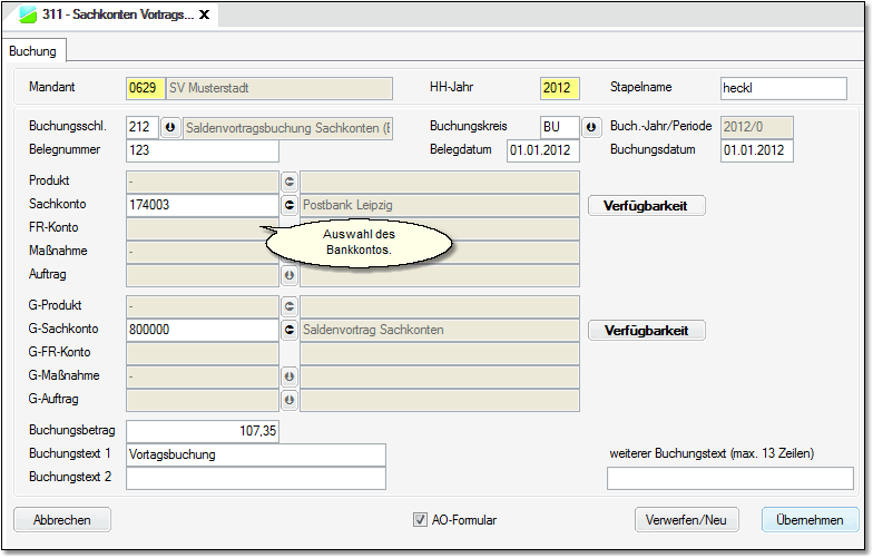 Im Jahr 2012 mit Buchungsschlüssel 212 die Vortragsbuchung, die im Kassenjahreswechsel auf dem Bankkonto automatisch erfolgte, manuell korrigieren.* Dazu oben in der Maske das Bankkonto auswählen.Erneut den Buchungsbetrag positiv eingeben.Diesmal kann das Belegdatum auch in 2012 liegen. Entweder 01.01.2012 oder 31.12.2011.Das Programm erzeugt folgende Umbuchung:Bank an Saldenvortragskonto SachkontenDamit stimmt das Bankkonto auch in der Eröffnungsbilanz 2012