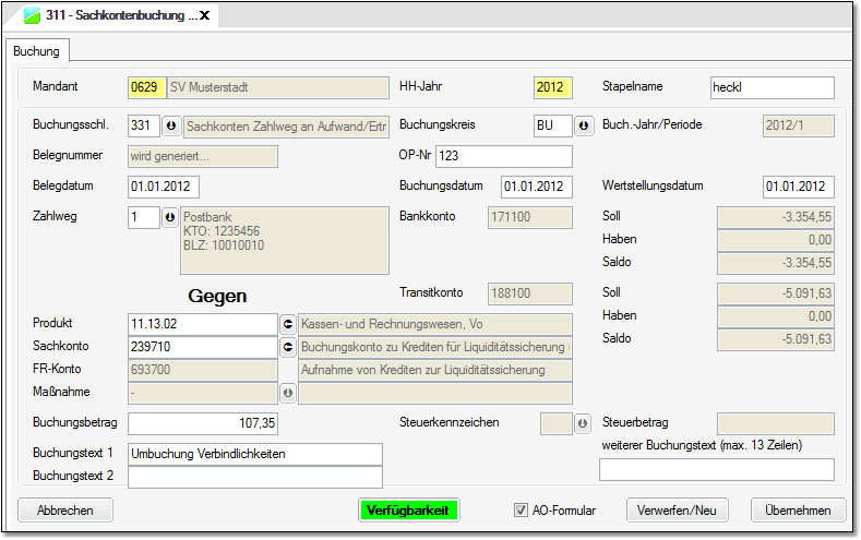 Im Jahr 2012 mit Buchungsschlüssel 331 die Verbindlichkeit wieder gegen das Bankkonto ausbuchen.* Wieder den entsprechenden Zahlweg auswählen.Die Gegenbuchungsstelle muss der Gegenbuchungsstelle aus a) entsprechen.Den Buchungsbetrag wieder positiv eingeben. Diesmal muss das Belegdatum in 2012 liegen – am besten 01.01.Das Programm erzeugt folgende Umbuchung:Verbindlichkeit (Gegenkonto) an Bank (aus Zahlweg)Somit ist das Verbindlichkeitskonto in 2012 wieder ausgeglichen und der Bankbestand stimmt auch wieder.