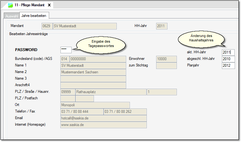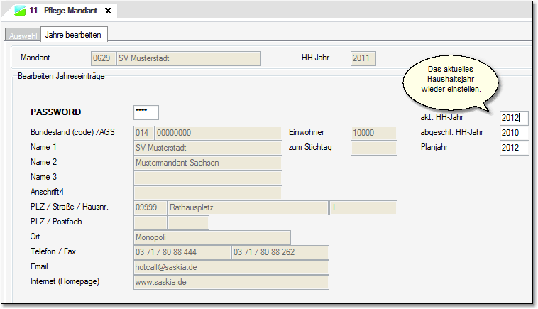 Für die Aktion benötigen Sie das Tagespasswort (da sich dieses immer ändern kann, würde ich Sie bitten, dieses an der Hotline zu erfragen). Nach Eingabe des Tagespassworts können Sie im rechten Bereich der Maske die Jahre pflegen. Achten Sie bitte darauf, dass in allen 3 Zellen der korrekte Wert steht. Es sollte sich nur das akt. HH-Jahr ändern. Unter Umständen ändern sich auch die anderen Felder, da diese in der Regel zueinander in Verbindung stehen. Sollte eine Meldung kommen, dass die Eintragung nicht korrekt ist, müssen Sie diese wiederholen. Es handelt sich um eine Sicherheitsabfrage.