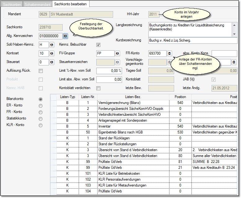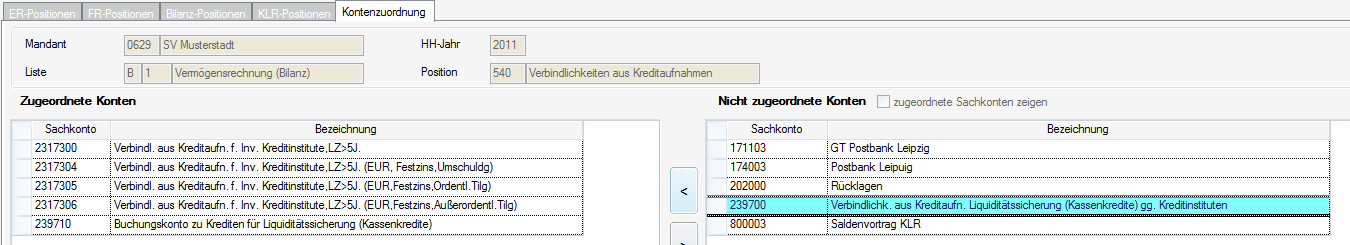 Im Schattenmandanten sollte ein solches Konto vorhanden sein. Sie können z. B. auf das Konto 239710 – „Buchungskonto zu Krediten für Liquiditätssicherung (Kassenkredite)“ zurückgreifen. Diese Konto kann jedoch auch manuell anlegt werden. Um alle Buchungen durchführen zu können sollte für das Konto die Überbuchbarkeit zulässig sein (ACHTUNG!!! das Konto muss auch der Bilanz zugeordnet werden).
