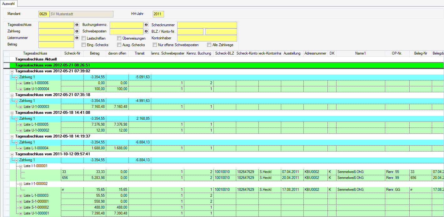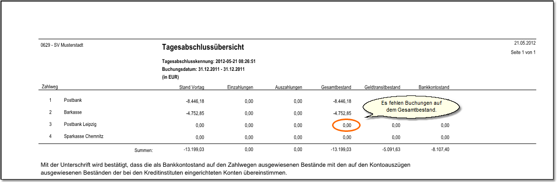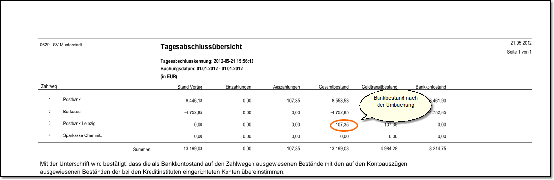Im Anschluss die Buchungen anordnen (Menüpunkt: 36) und den Buchungsstapel verbuchen. Wenn Sie jetzt den Tagesabschluss durchführen, werden Sie feststellen, dass der Bankbestand aktuell wieder stimmt.