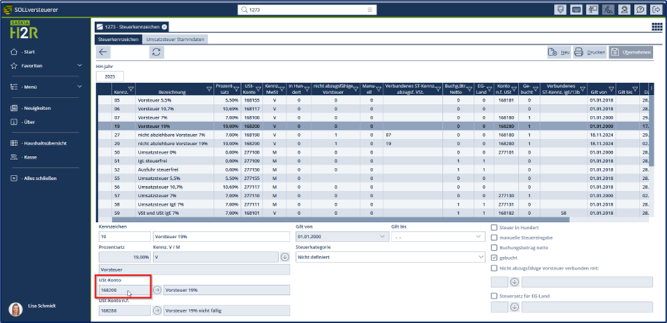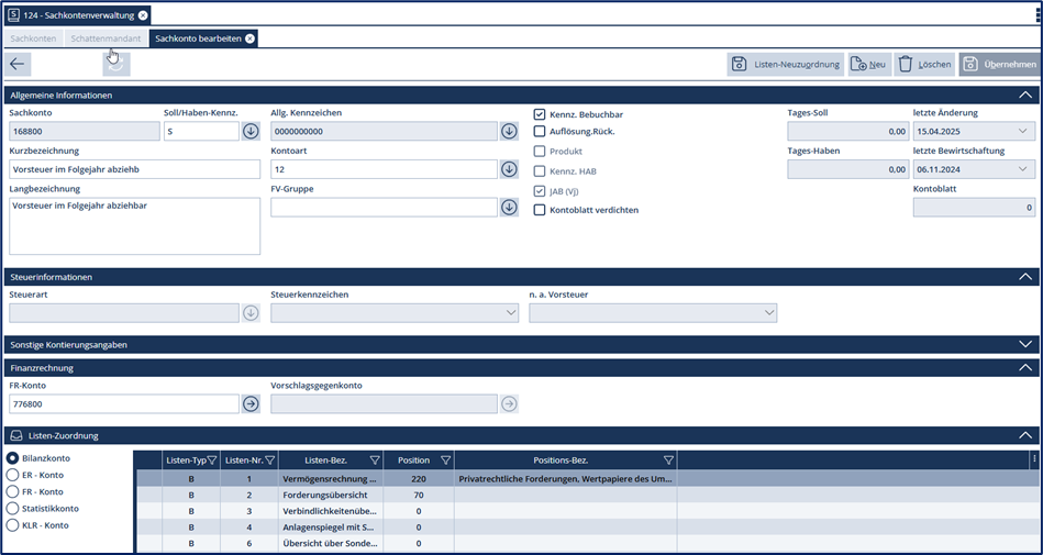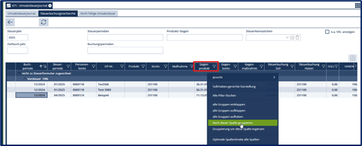Wenn Buchungs- und Steuerperiode einer Buchung voneinander abweichende Haushaltsjahre haben, wird empfohlen, die Summe dieser Buchungen pro Steuerkennzeichen und Produkt auf ein separates Konto umzubuchen: