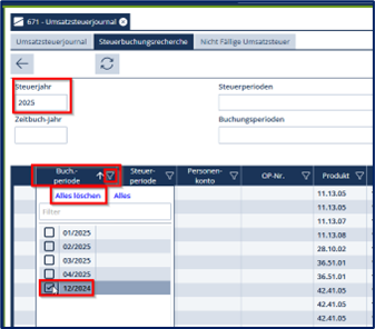 - Filter Buchungsperiode Alle löschen und nur die Perioden wählen, die abweichend vom Steuerjahr sind