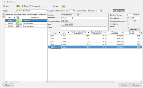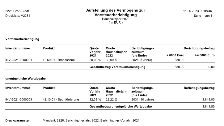 Nach Hinterlegung der notwendigen Stammdaten zur Ermittlung der Berichtigungswerte kann eine Auswertung als buchungsbegründender Beleg erzeugt werden. Hier werden in zwei Blöcken die Werte bei Erhöhung er privatrechtlichen Quote und bei Minderung der privatrechtlichen Quote unterschieden.