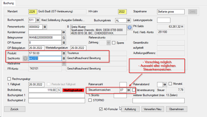 - beliebige Eingabe von Steuerkennzeichen möglich (auch nicht steuerbar!)