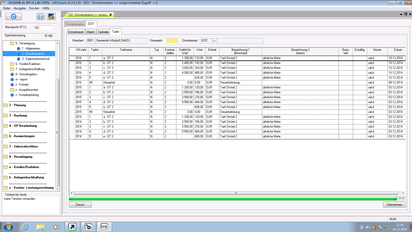 Staffeltarife werden in Menü 152 - Stammdaten - Veranlagung - Einnahmearten - gepflegt.