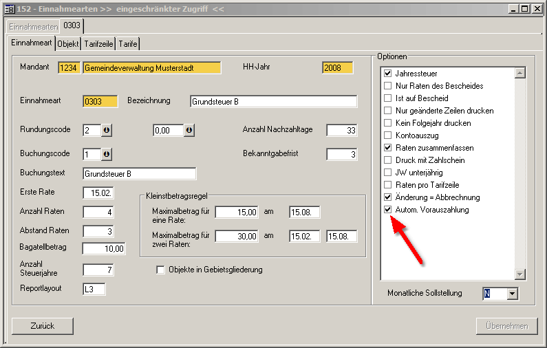 Um für die Grundsteuer die automatische Vorauszahlung nutzen zu können, muss in der entsprechenden Einnahmeart das Kennzeichen "Autom. Vorauszahlung" gesetzt werden.