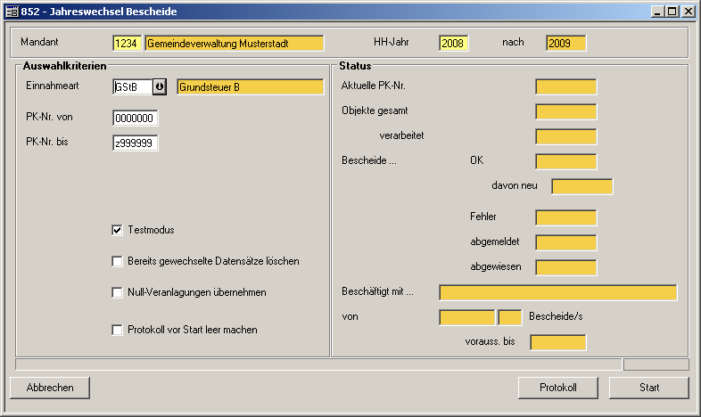 Vor der Übernahme der Bescheiddaten sollte mit Hilfe des Testmodus überprüft werden, welche Bescheide übernommen werden können, da anders als bei dem üblichen Jahreswechsel, für Einnahmearten im Modus "automatische Vorauszahlung" keine Möglichkeit besteht den Jahreswechsel für bereits gewechselte Objekte zu wiederholen, da die Vorauszahlungen bereits verbucht sind. Die Option "Bereits gewechselte Datensätze löschen" hat somit keine Wirkung mehr.