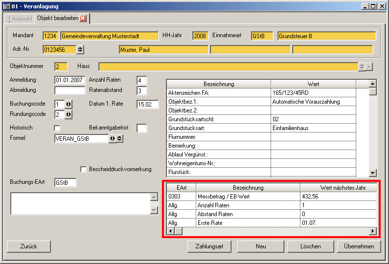 Für die Folgejahresraten auf dem Bescheid, werden die entsprechenden Bekanntgabeverhältnisse in den Objektbeschreibungen hinterlegt, d. h. die Wechseldaten in der rechten unteren Tabelle "Anzahl Raten", "Abstand Raten" und "Erste Rate" werden berücksichtigt.