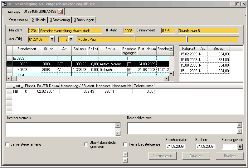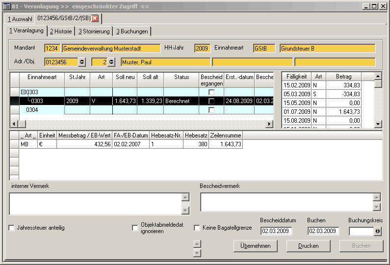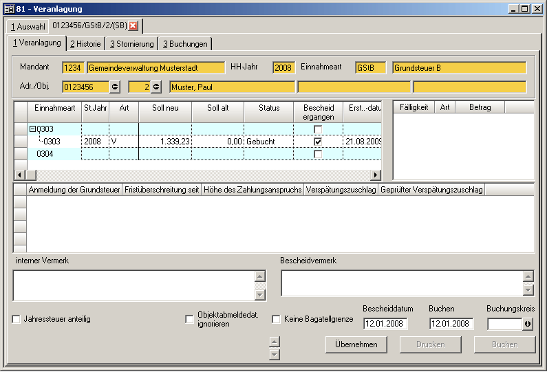 Laut Grundsteuergesetz gelten die Vorauszahlungsbeträge als festgesetzt unter dem Vorbehalt der Nachprüfung. Diese Nachprüfung kann im Programm einzeln für ein bestimmtes Steuerobjekt oder mit Hilfe der Gesamtveranlagung für alle Steuerfälle erfolgen. a) Festsetzung einzelner Steuerobjekte Werden einzelne Steuerobjekte festgesetzt, kann in dem neuen Steuerjahr in der Einzelveranlagung der Debitor mit dem jeweiligen Steuerobjekt geöffnet werden.