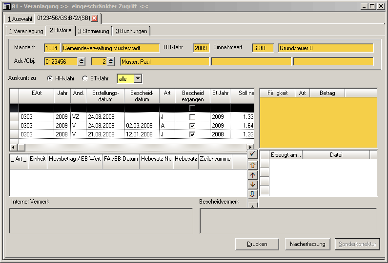 Der neu entstandene Bescheid erhält nun auch nach dem erfolgreichen Druck den Vermerk, das der Bescheid erfolgreich erstellt wurde. Für die automatische Vorauszahlung wird weiterhin eine Zeile angezeigt. Hier wurde aber nie gebucht und gedruckt. Dies ist in der Registerkarte "Historie" zu erkennen.
