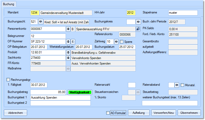 Die Ausgabe von Verwahrgeldern werden im Rahmen einer kreditorischen Sollstellung auf das extra dafür angelegte Personenkonto eingebucht.