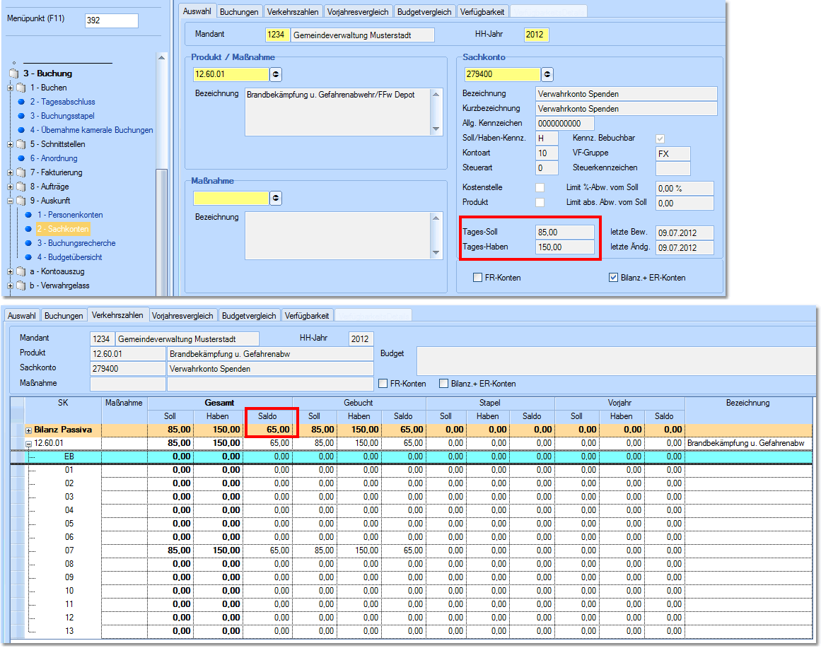 In der Sachkontenauskunft des Verwahrgeldkontos (Reiter VKZ) kann ebenfalls ein Saldo eingesehen werden, der jedoch nur Saldierungen in den Perioden des ausgewählten Haushaltsjahres zeigt.